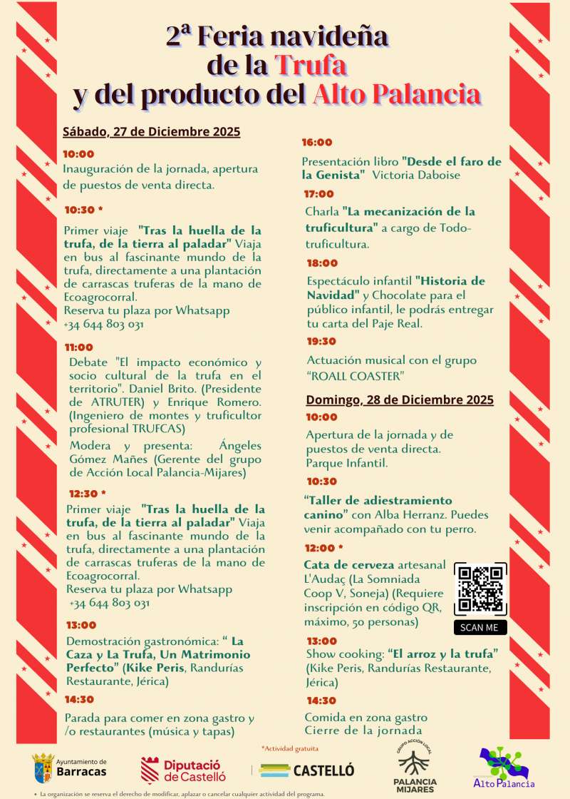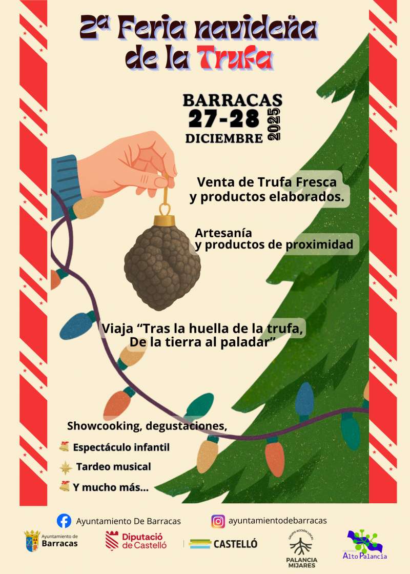Cartel de la feria. EPDAEl Ayuntamiento de Barracas organizará el próximo 27 y 28 de diciembre, la II Feria navideña de la trufa y del producto del Alto Palancia, una cita que reunirá trufa fresca y productos elaborados, además de artesanía y productos de proximidad, en un ambiente festivo pensado para todos los públicos. El evento cuenta con una subvención del Patronato de Turismo de la Diputación de Castellón .Bajo el lema “Tras la huella de la trufa, de la tierra al paladar”, la feria incluirá propuestas gastronómicas y de dinamización como showcooking, degustaciones, espectáculo infantil y tardeo musical, entre otras actividades.