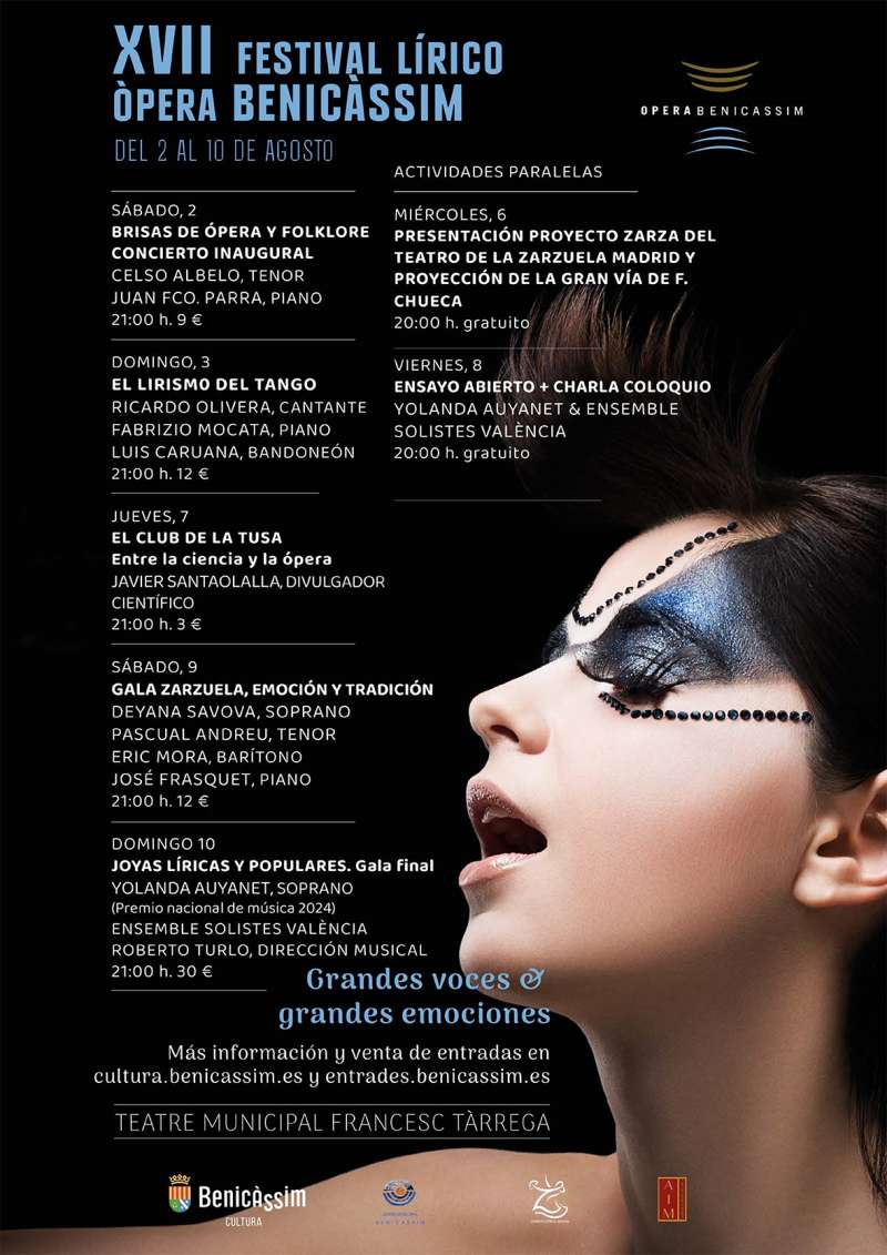 Programa del Festival de Ópera de Benicàssim 2025. /EPDAEl Festival Lírico Ópera Benicàssim, albergará cuatro recitales de reconocidos artistas nacionales e internacionales como Celso Albelo, Ricardo Olivera, Deyana Sávova, Eric Mora y Pascual Andreu y Yolanda Auyanet, en el Teatre Municipal Francesc Tàrrega a las 21h. El acontecimiento cultural, organizado por el Ayuntamiento de Benicàssim y bajo la dirección artística de Roberto Turlo, programará diversas actividades paralelas gratuitas en su decimoséptima edición, que bajo el lema Grandes voces, grandes emociones se celebrará del 2 al 10 de agosto. Las entradas para los conciertos se pueden adquirir en www.cultura.benicassim.es y entrades.benicassim.es.