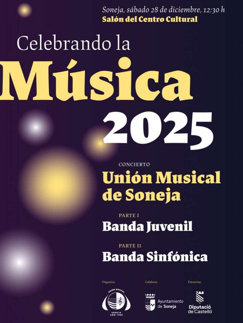 El concierto estará protagonizado por la Banda Unión Musical de Soneja, que pone el broche final a un año 2025 especialmente significativo en el que ha celebrado su 125 aniversario y ha logrado el triunfo en el certamen autonómico de bandas. En esta cita participarán tanto la Banda Juvenil como la Banda Sinfónica, ofreciendo un repertorio pensado para todos los públicos y adecuado para disfrutar en familia.