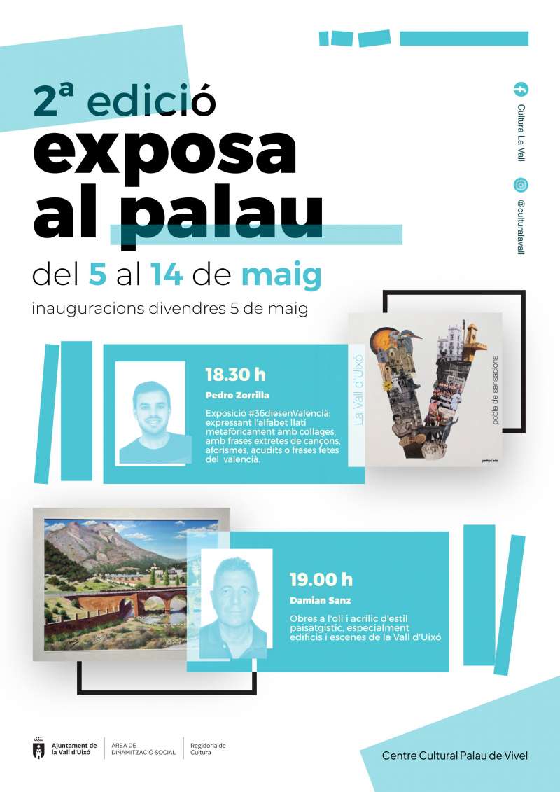 Pedro Zorrilla y Damián Sanz abrirán la segunda edición del proyecto Exposa al Palau. Del 5 al 14 de mayo expondrán sus obras gracias a esta iniciativa de la Concejalía de Cultura del Ayuntamiento de la Vall d'Uixó. El objetivo es "abrir las puertas de este espacio cultural a los artistas locales que quieren mostrar sus creaciones artísticas", tal y como ha explicado la concejala del área, Maria Cruces.