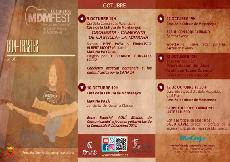 Los conciertos comenzarán el día 9 de octubre, día de la Comunidad Valenciana, rindiendo homenaje a los damnificados de la DANA 2024, este homenaje estará a cargo de la Orquesta-Camerata de Castilla, La Mancha,dirigida por Eduardo González, una formación comprometida con la excelencia artística que ofrecerá un repertorio musical singular y extraordinario, con Pepe Payá, y Francisco Albert Ricote a la guitarra y con la voz privilegiada de Marina Payá, que además, el día 10 de octubre repetirá actuación, esta vez como solista deguitarra. Marina está inmersa en una gira como ganadora de la beca especial "Aquí Medios de Comunicación" para jóvenes guitarristas de la Comunidad Valenciana.