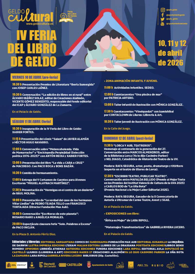 Programa del evento. EPDAGeldo volverá a convertirse en epicentro cultural del Alto Palancia con la celebración de la IV Feria del Libro, que tendrá lugar del 10 al 12 de abril de 2026. Este evento, ya plenamente consolidado en la comarca y en la provincia de Castellón, reafirma el firme compromiso del municipio con la promoción de la lectura, la creación literaria y el acceso a la cultura en el entorno rural.