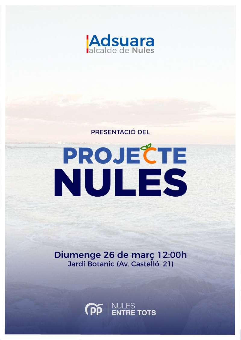 Presentación Projecte Nules. /EPDAEl candidato del PP a la alcaldía de Nules, José Adsuara, ha apelado al sentido común como "la única alternativa para que nuestro pueblo vuelva a ser un referente". Lo ha hecho con motivo de la presentación, este domingo 26 de marzo, del Projecte Nules, un plan de gobierno "que nace de la escucha activa y constante a los vecinos y que lo presentan vecinos que tienen la voluntad de servir".