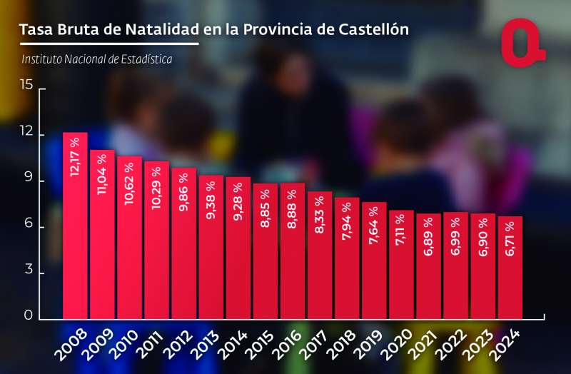 Gráfico con los datos publicados en el INE de la tasa de natalidad desde 2008. / JAIME SORIANOLa provincia de Castellón atraviesa una etapa de mínimos históricos en materia de natalidad. Los últimos datos publicados por el Instituto Nacional de Estadística (INE) confirman que la tasa de nacimientos ha vuelto a descender y se sitúa en 6,71 nacimientos por cada mil habitantes en 2024, la cifra más baja registrada en la serie histórica. Esta tasa supone una caída del 45% respecto al máximo alcanzado en 2008, cuando Castellón llegó a los 12,17 nacimientos por mil habitantes. El retroceso no es puntual, sino el resultado de un proceso sostenido en el tiempo.