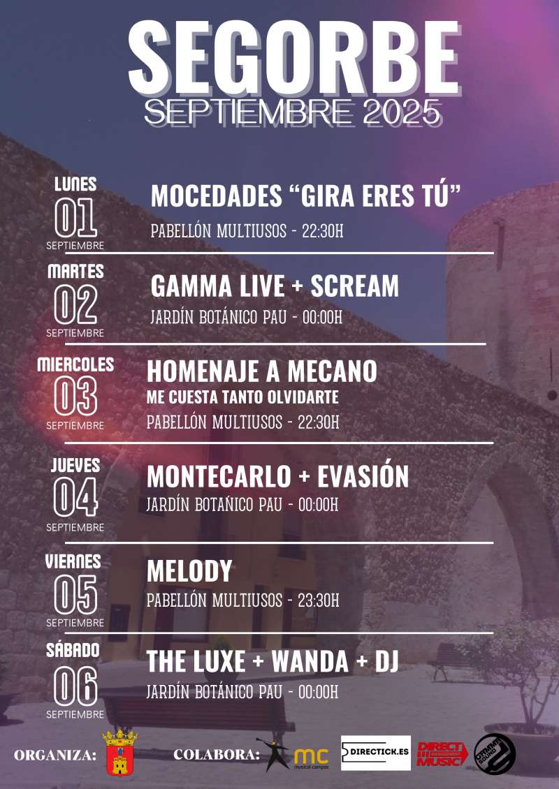 Con el inicio de las Fiestas Patronales de Segorbe, el lunes 1 de septiembre el pabellón multiusos acogerá la actuación de Mocedades con su "Gira eres tú". La primera verbena, que tanto gusta en Segorbe, reinará la noche del martes 2 de septiembre con Gamma Live y Scream en el idílico Jardín Botánico Pau.