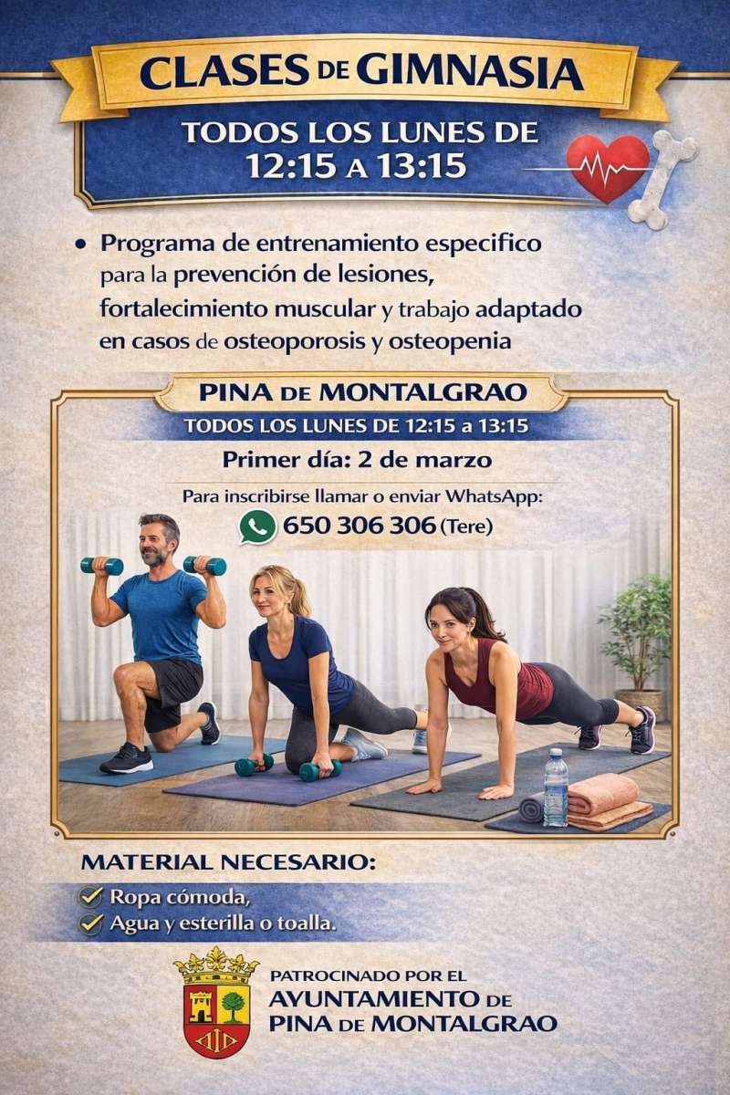 El municipio de Pina de Montalgrao ha puesto en marcha desde principios de marzo nuevas clases de gimnasia orientadas a la prevención de lesiones y al fortalecimiento muscular. Las sesiones se celebran todos los lunes y están dirigidas a vecinos y vecinas que desean mejorar su condición física, mantener una vida activa y cuidar su salud a través del ejercicio.