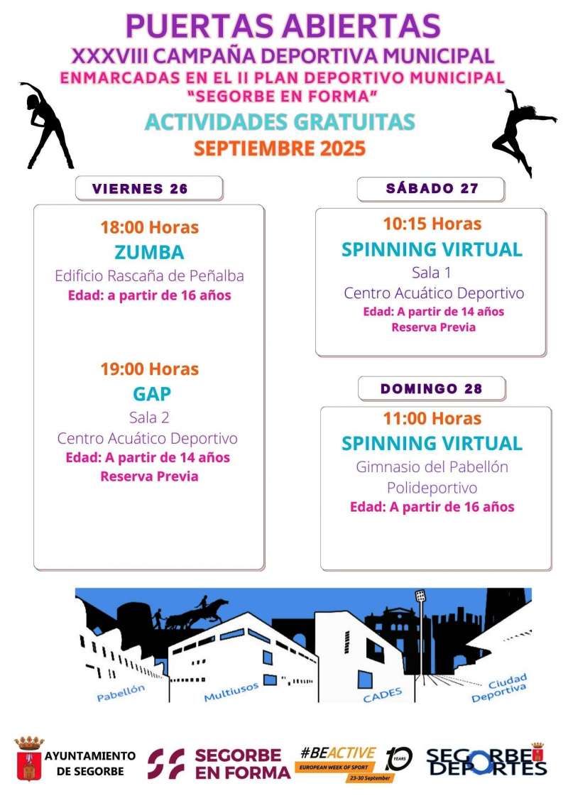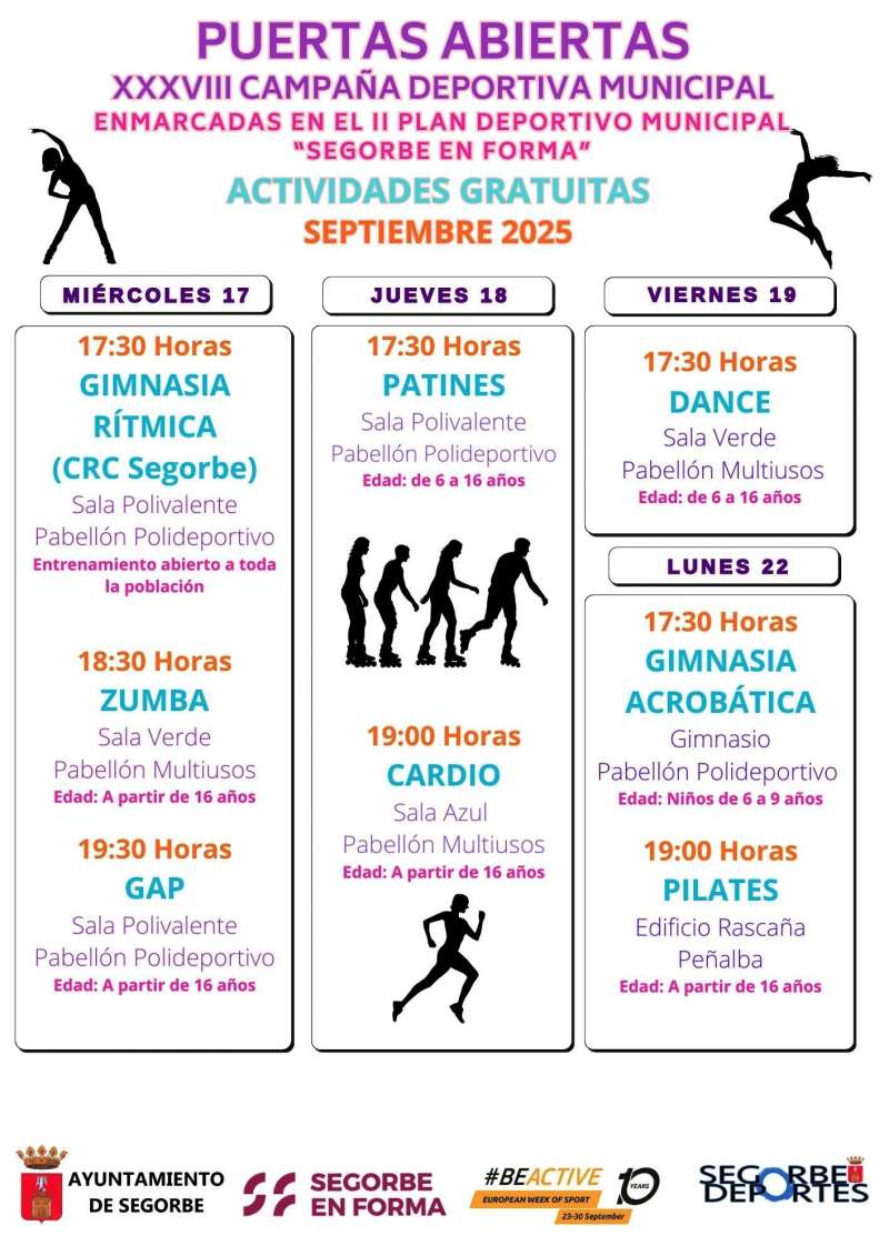 Desde el miércoles 17 de septiembre hasta el martes 30 del mismo mes, el Ayuntamiento de Segorbe, mediante la concejalía de Deportes, ofrecerá un año más jornadas de puertas abiertas con opciones deportivas gratuitas para todas las edades.